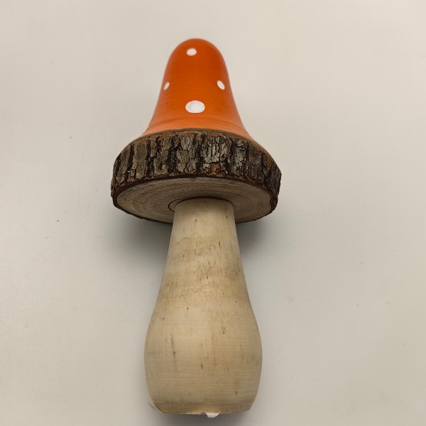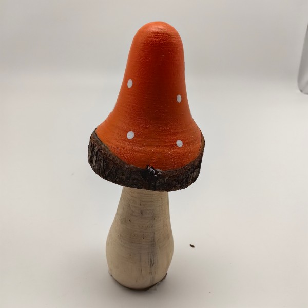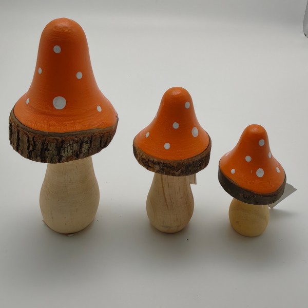 Solid-wood mushroom trio with kiln-dried stems and hand-sprayed gold speckles on painted caps. 2-10 in. heights, flat bases for tiered trays, mantels or woodland wedding centerpieces. Sold in 12-piece kraft box—bulk pricing available.