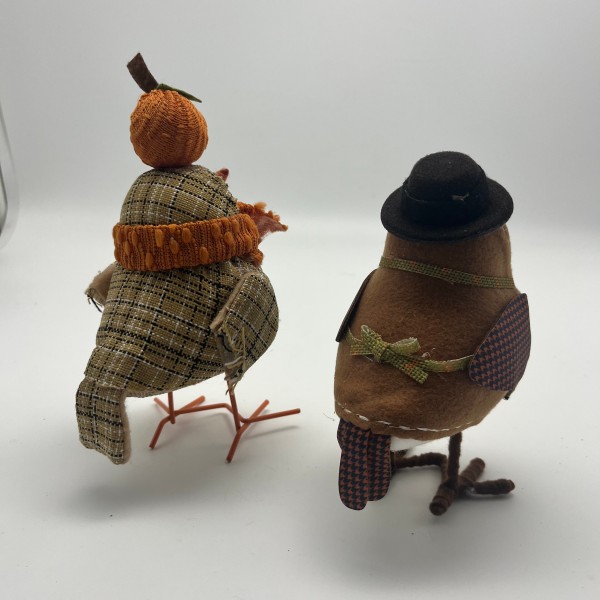 Bring a touch of autumnal whimsy to your decor with our charming fabric birds. These delightful figures are crafted with care, featuring birds dressed in seasonal clothing, one adorned with a pumpkin hat and the other with a stylish top hat, both adding a playful touch to any setting. Ideal for placing on shelves, desks, or mantelpieces, these fabric birds are a delightful addition to your fall-themed decor. Each bird is meticulously made to ensure a high-quality, long-lasting decoration that will be a cherished part of your autumn celebrations. Embrace the season's spirit with these delightful and festive autumn-themed fabric birds.