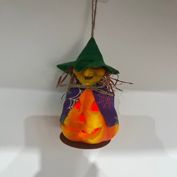Get into the Autumn spirit with our enchanting witch pumpkin ornament. This decoration showcases a pumpkin with a carved smiling face, giving off a warm, inviting glow, and is topped with a playful witch hat, adding a dash of whimsy to your spooky festivities. Ideal for hanging from doors, trees, or as part of your indoor Autumn display, this ornament is crafted to bring joy and a festive ambiance to your home. Each piece is made with care to ensure it's a durable and delightful addition to your Autumn celebrations, year after year.