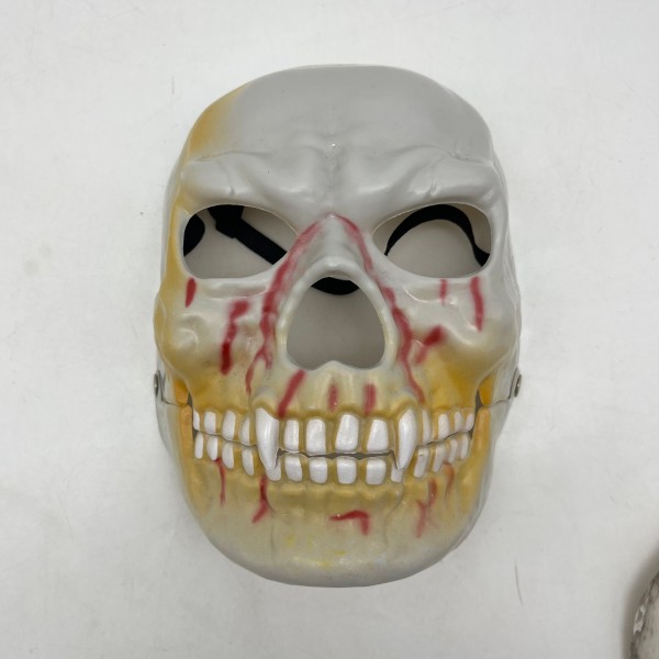Embrace the undead with our Bloody Skull Mask. This striking mask features a weathered white skull base, accented with vivid red blood streaks and aged yellowing around the cheekbones and jawline. The hollow eye sockets and grinning mouth create a terrifyingly realistic look. Its lightweight design and adjustable strap ensure comfort, making it perfect for Halloween zombie costumes, horror-themed parties, or haunted house attractions.